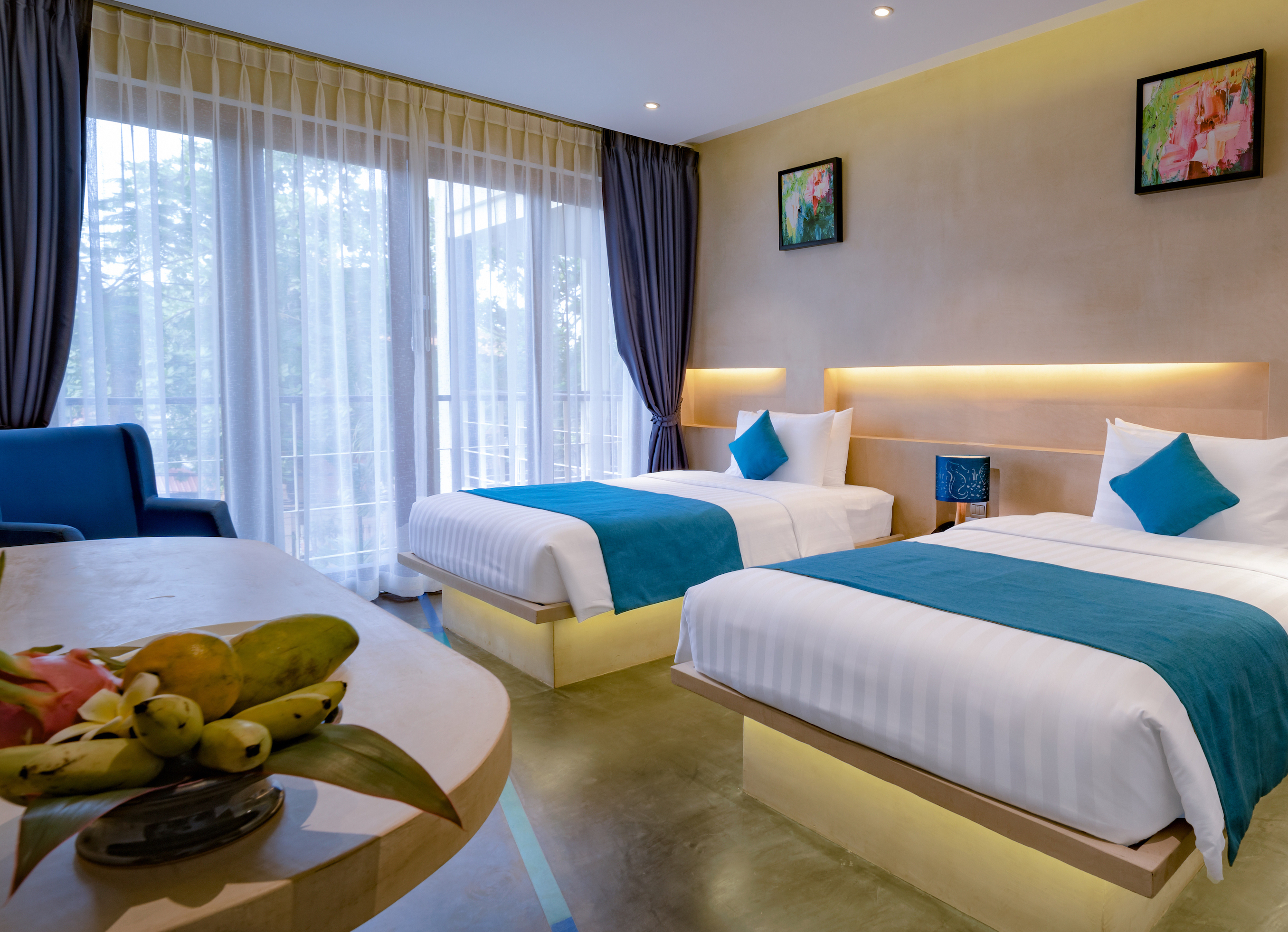 Tastefully appointed, contemporary-styled with light and bright pastel tones all Deluxe King Pool View rooms provide one King bed, Deluxe Twin Pool View Provide with twin bed, pillow selection menus to ensure your comfort, complementary beverage selections including Tea & Coffee and bottled drinking water. Tea, coffee and water are replenished daily. Each room has a balcony overlooking the cool and sparkling fresh swimming pool, the ideal vantage point to enjoy a morning coffee or evening ale, whichever is your heart’s desire. Each bathroom has a rain shower cubicle and quality amenities that are fully serviced and replenished daily.