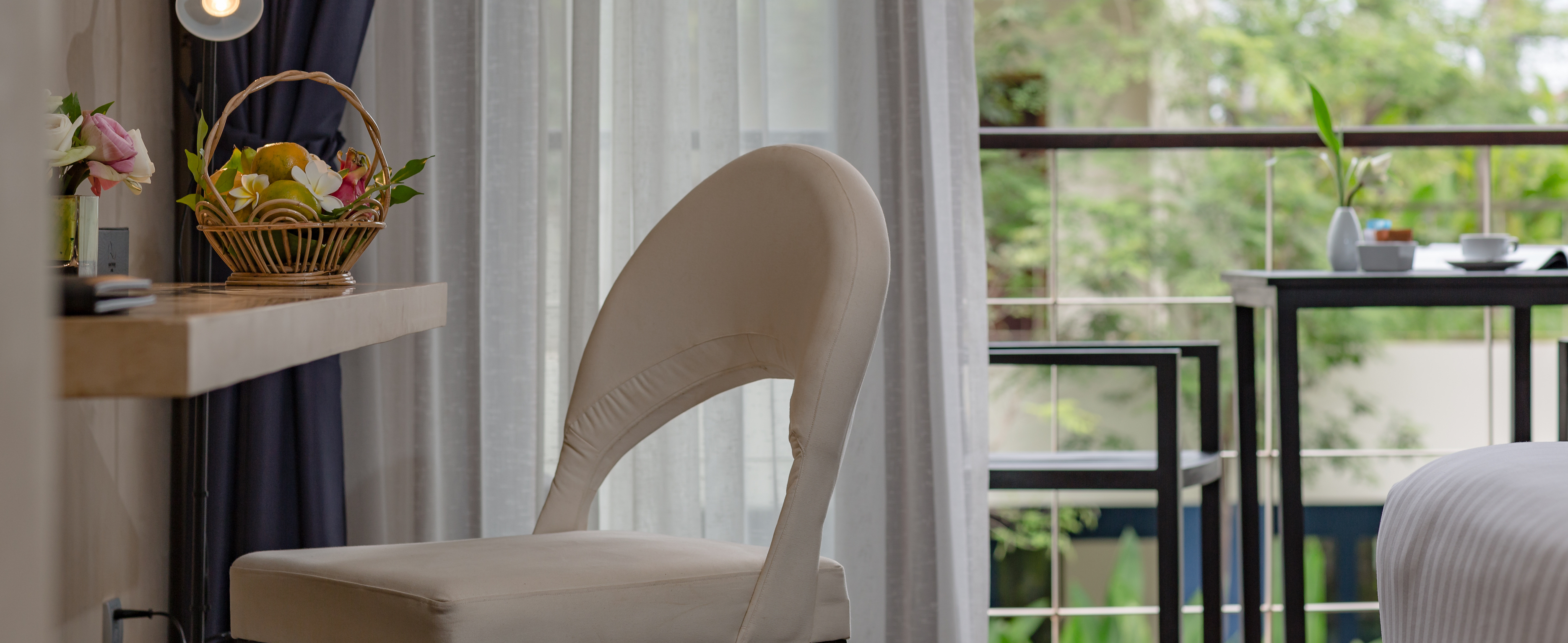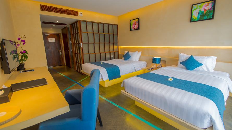 Tastefully appointed and contemporary-styled with light and bright pastel tones all Deluxe Twin Pool View rooms provide two twin beds, luxury quality bedding, pillow selection menus to ensure your comfort, complementary beverage selections including Tea & Coffee and bottled drinking water. Tea, coffee and water are replenished daily. Each room has a balcony overlooking the cool and sparkling fresh swimming pool, the ideal vantage point to enjoy a morning coffee or evening ale, whichever is your heart’s desire. Each bathroom has a rain shower cubicle and quality amenities that are fully serviced and replenished daily.