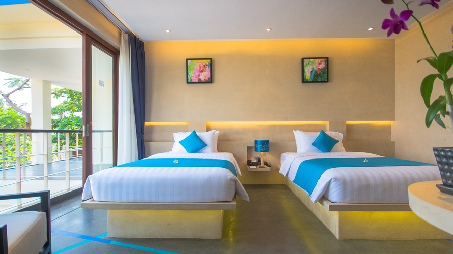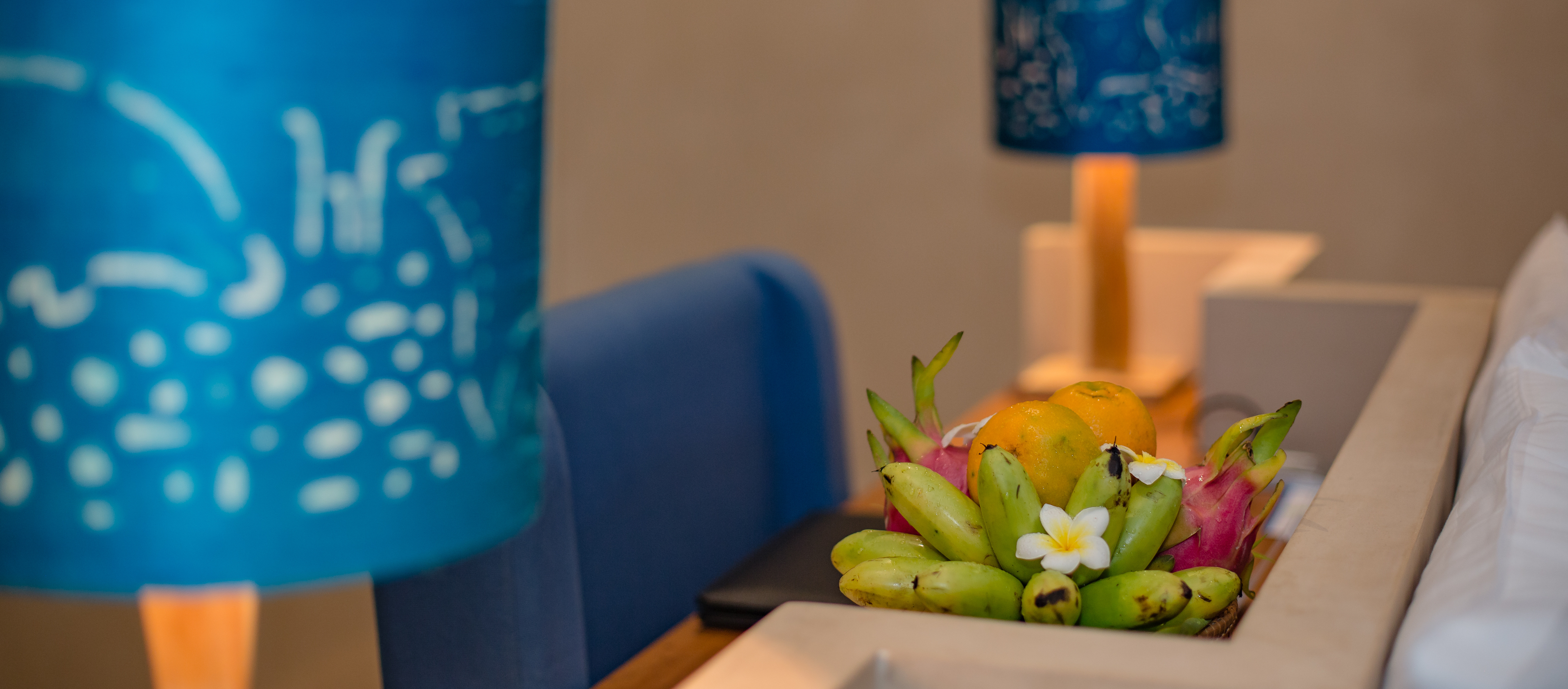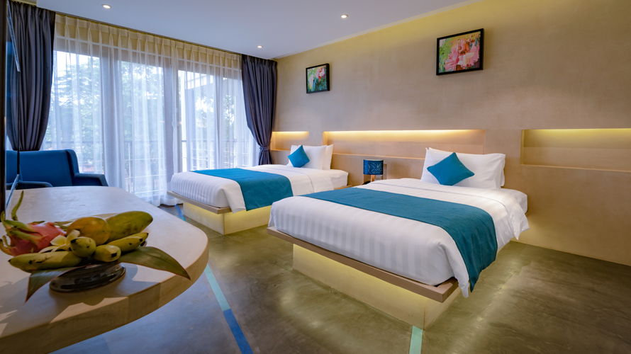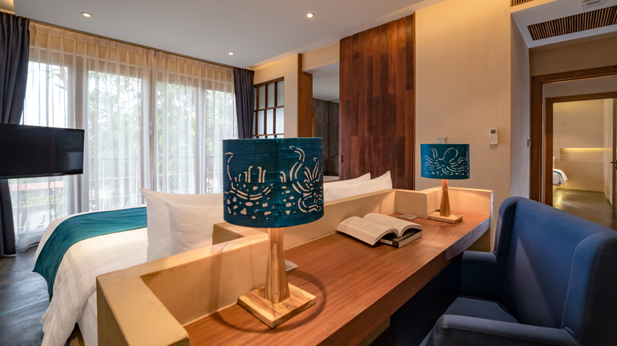 Tastefully appointed, contemporary-styled with light and bright pastel tones all Family Suites have Two Bedrooms, one with a King bed and the other with two Twin beds. All are topped with premium quality linen bedding, pillow selection menu for your comfort, complementary beverage selections including Tea & Coffee and bottled drinking water. Tea, coffee and water are replenished daily. Each bedroom has its own bathroom and toilet. The King bedroom has a pedestal standalone bathtub and separate rain shower cubicle. The Twin bedroom does not include a bathtub. Both bedrooms overlook the garden.