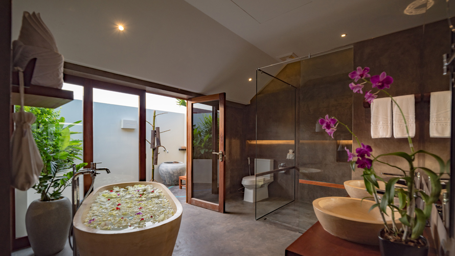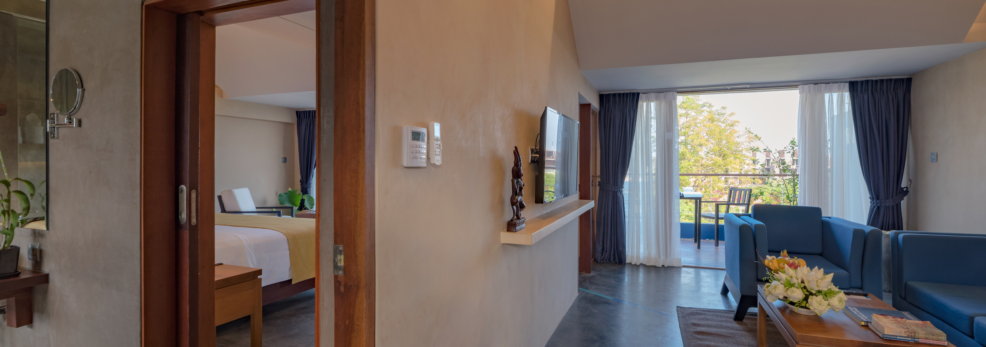 Tastefully appointed, contemporary-styled suite on the exclusive third floor of the hotel with pool or city views, private courtyard access, stucco walls and one King-sized bed on wooden frame. Beds are topped with premium quality linen bedding and pillow selection menu for your comfort. Each suite has a separate lounge area with attic-styled roof, rustic bathroom with wooden floor and twin sinks, free-standing shower and a rain shower plus a spacious bathtub for two, wooden workbench and chair. A large landscaped balcony with wooden furniture. A complementary beverage selections is provided including Tea & Coffee and bottled drinking water. Tea, coffee and water are replenished daily.